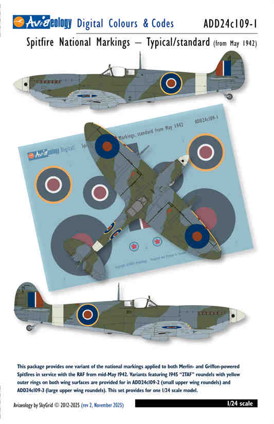 Aircraft decals (military) Descriptive text:This package provides one variant of the national markings applied to both Merlin- and Griffon-powered Spitfires in service with the RAF from mid-May 1942 to early January 1945.This set provides