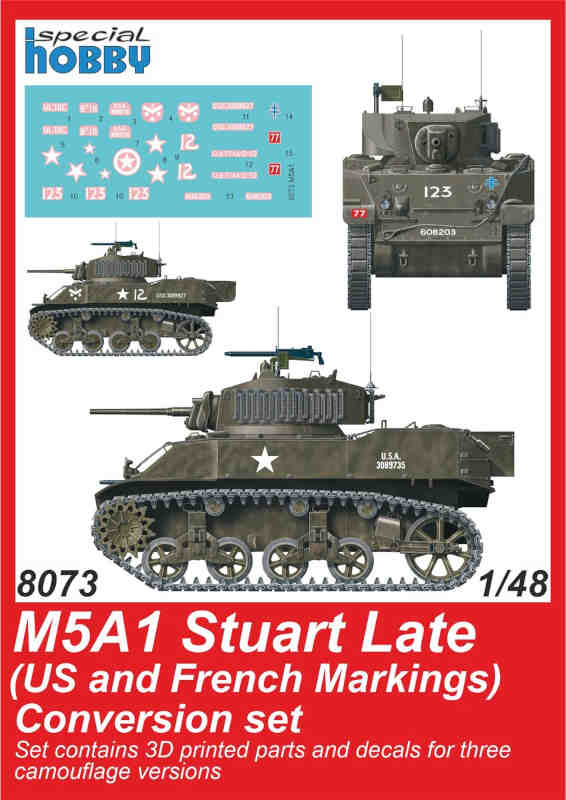 Military vehicle conversions (resin) (designed to be used with Tamiya kits) Nicely detailed conversion set enabling the modeller to convert his M5A1 Stuart into the late variety. The set parts are made using a 3D printer and the set comes also